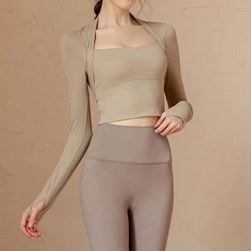Here’s a clean, polished description based on the style you provided earlier (the women’s elegant long-sleeve yoga shawl sports top with chest cushion). Since you didn’t paste the specifications this time, I’ll craft the description from the product style only: